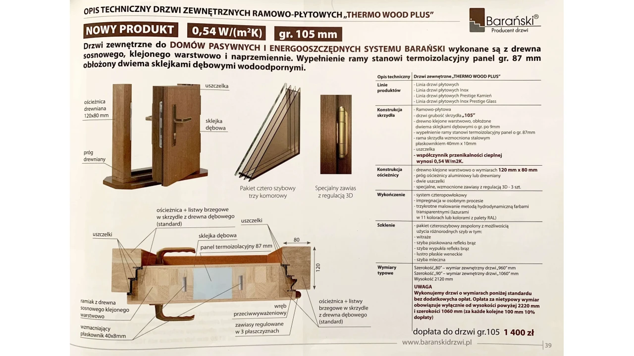 Drzwi zewnętrzne do DOMÓW PASYWNYCH I ENERGOOSZCZĘDNYCH systemu Barański wykonane są z drewna sosnowego, klejonego warstwowo i naprzemiennie. Wypełnienie ramy stanowi termoizolacyjny panel o grubości 78 mm obłożony dwiema sklejkami dębowymi i wodoodpornymi. Kolorystyka oraz modele dostępne w galerii zdjęć.