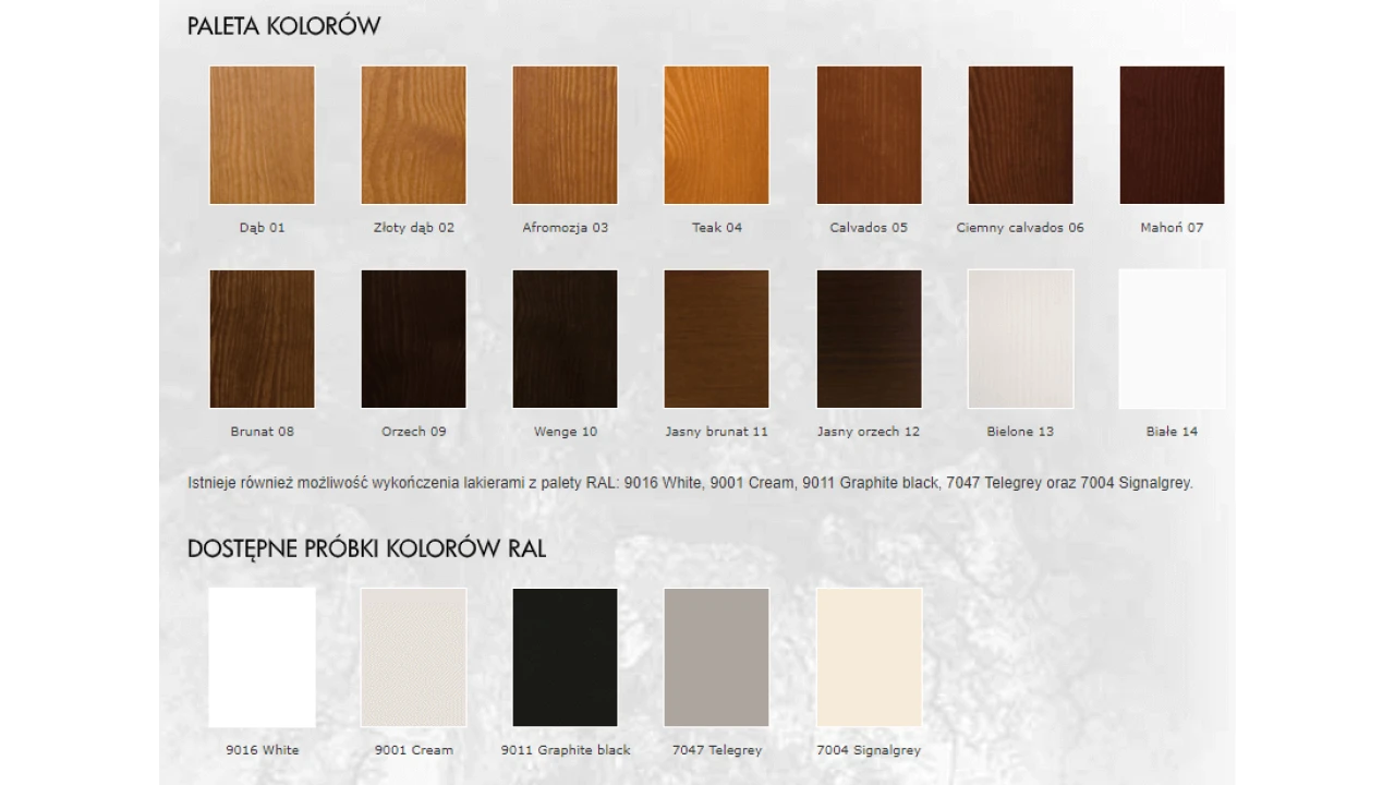 Drzwi wewnętrzne Grand produkowane są z drewna sosnowego, jesionowego lub dębowego i dostępne są w bogatej palecie kolorystycznej, jak również surowe do samodzielnego wykończenia. Kolorystyka dla skrzydła drzwiowego dostępna w galerii zdjęć.