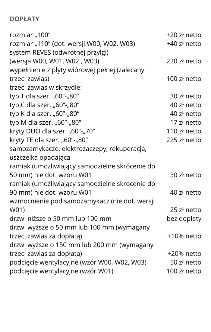 - w przypadku skrzydła z samozamykaczem oraz ościeżnicą DIN lub metalową należy zastosować zawiasy typ T w ilości „60”-„80” – 3 szt.; „90”-„110” – 4 szt. (dopłata za dodatkowy zawias typ T w wysokości 30/36,90)