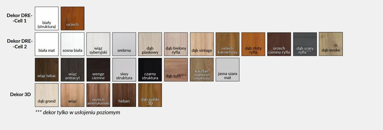 Drzwi wewnętrzne DRE Standard to uniwersalny model, który doskonale sprawdzi się zarówno w klasycznych jak i nowoczesnych aranżacjach. Dzięki szerokiej ofercie oklein, z łatwością dobierzemy kolorystykę pasującą do naszych pomieszczeń. Drzwi występują w wariancie przylgowym, bezprzylgowym oraz przesuwnym. Kolorystyka i wzory skrzydła drzwiowego dostępne w galerii zdjęć.