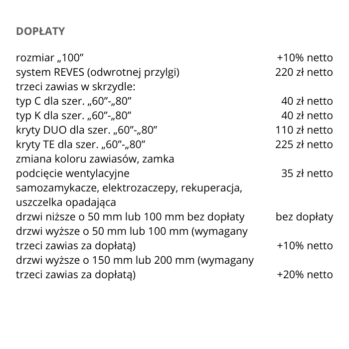 Możliwość wykonania za dopłatą w standardzie: bezprzylgowe, rewersyjne.