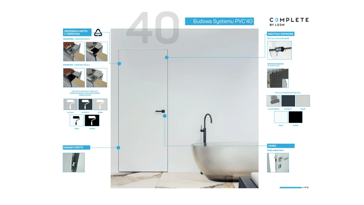 Drzwi ukryte Leon to idealna propozycja dla tych, którzy cenią sobie nowoczesne rozwiązania. Świetnie sprawdzą się w minimalistycznie urządzonych pomieszczeniach. Dzięki ukrytej ościeżnicy zaoszczędzimy miejsce w naszych pomieszczeniach, przedłużymy optycznie ścianę, przy czym nie zaburzają aranżacji wnętrza. Pełne skrzydło wykonane z wysokiej jakości aluminium jest łatwe w czyszczeniu oraz jego trwałość zapewni nam komfort użytkowania na wiele lat. Komplet ten został przystosowany do malowania farbami ściennymi, dzięki czemu możliwym staje się dokładniejsze dostosowanie go do wnętrza oraz ukrycie drzwi w ścianie.