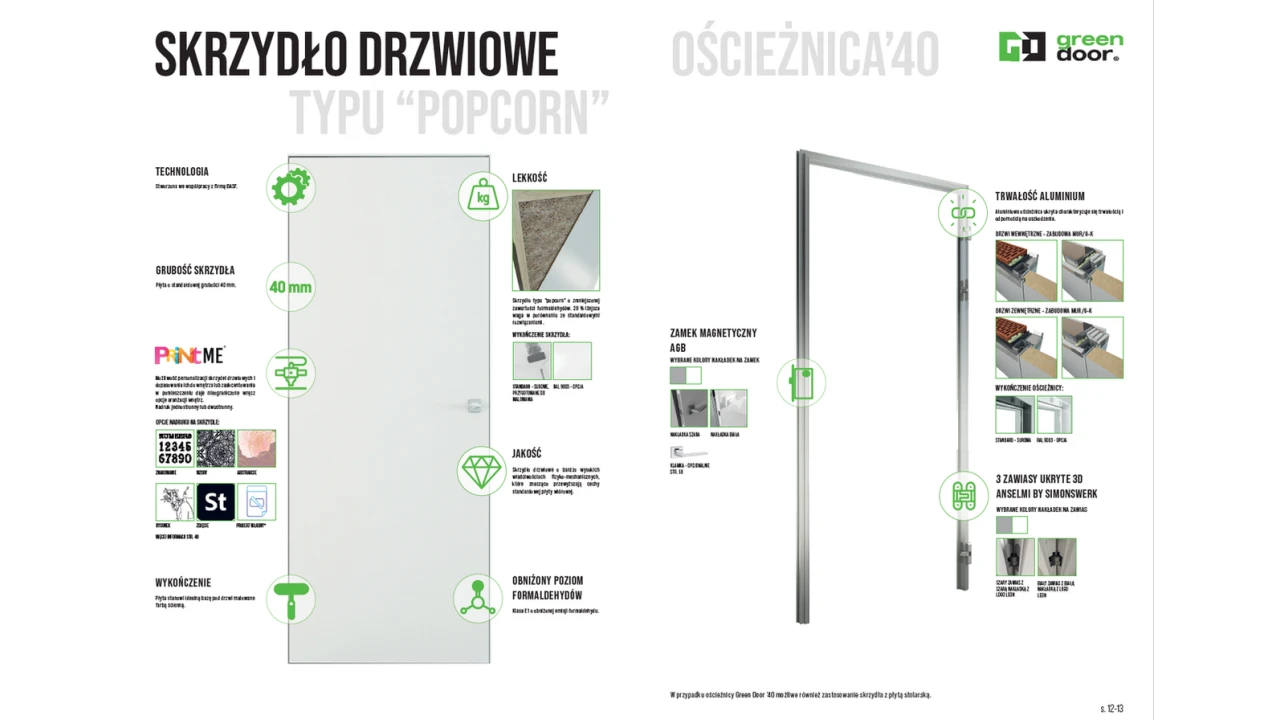 Drzwi ukryte Leon to idealna propozycja dla tych, którzy cenią sobie nowoczesne rozwiązania. Świetnie sprawdzą się w minimalistycznie urządzonych pomieszczeniach. Dzięki ukrytej ościeżnicy zaoszczędzimy miejsce w naszych pomieszczeniach, przedłużymy optycznie ścianę, przy czym nie zaburzają aranżacji wnętrza. Pełne skrzydło wykonane z wysokiej jakości aluminium jest łatwe w czyszczeniu oraz jego trwałość zapewni nam komfort użytkowania na wiele lat. Drzwi ukryte GreenDoor Standard’40 to zestaw wpisujący się w serię naszych produktów stworzonych z myślą o ekologii. W jego skład wchodzi aluminiowa ościeżnica niewidoczna oraz skrzydło o grubości 40 mm, które może posiadać wypełnienie typu popcorn bądź płyta stolarska. Montowane jest na ościeżnicy wewnętrznej lub zewnętrznej przeznaczonej zarówno do montażu w murze, jak i płycie gipsowo-kartonowej. Ponadto cały komplet jest przystosowany do malowania farbami ściennymi. Dodatkowo każdy zamówiony komplet równa się posadzeniu jednego drzewa przez nas we współpracy z posadzimy.pl