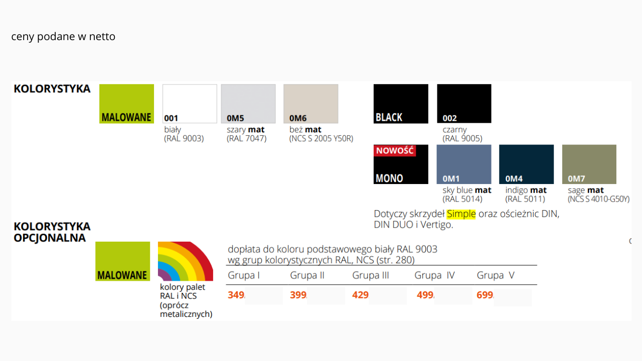 Nowoczesna kolekcja SIMPLE z poziomymi frezowaniami. Dzięki niemal nieograniczonym możliwościom kolorystycznym palet RAL i NCS dobierzesz wyjątkowy odcień dla skrzydeł. . Uniwersalny design sprawi że skrzydło świetnie sprawdzi w klasycznych jak i nowoczesnych wnętrzach. Malowana powierzchnia skrzydła zapewni trwałość koloru na wiele lat. Dostępne w szybkiej realizacji w kolorze białym.