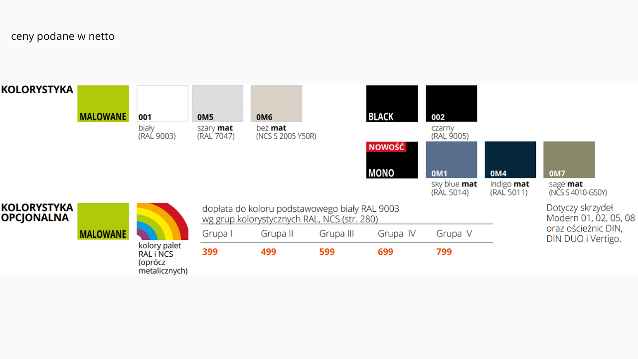Modern to nowoczesne drzwi, które nadadzą wnętrzom wyjątkowego charakteru. Podniosą prestiż wystroju Twojej przestrzeni. Szykowne profilowane skrzydła dobierzesz w wersji pełnej lub szklonej. Wysokiej jakości drzwi malowane dopełnią Twoją przestrzeń. Wysokiej jakości drzwi malowane dopełnią Twoją przestrzeń. Dzięki nieograniczonym możliwościom kolorystycznym palet RAL i NCS możesz dobrać idealny odcień do swoich wnętrz. 3 warstwowy system malowania oznacza trwałość koloru przez wiele lat. Dostępne w wariancie przylgowym jak i bezprzylgowym. Kolorystyka oraz warianty dostępne w galerii zdjęć.