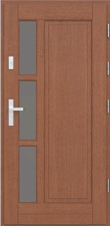 Drewniane drzwi zewnętrzne Agmar Rosa z kolekcji Klasycznej to drzwi o tradycyjnym designie połączonym z funkcjonalnością. Drzwi posiadają bardzo dobre parametry izolacji cieplnej. Bogate wyposażenie w standardzie. Drewniana konstrukcja (sosnowa lub dębowa) cieszy się niesłabnącą popularnością i zapewnia nam wytrzymałe drzwi na lata. Możliwość wykonania drzwi w niestandardowych rozmiarach sprawi że z łatwością dopasujemy drzwi do naszych potrzeb. Połączenie drewna z błyszczącym szkłem jest bardzo efektownym rozwiązaniem dla tych, którzy cenią sobie wysoki poziom estetyki. Postaw na sprawdzone rozwiązania.