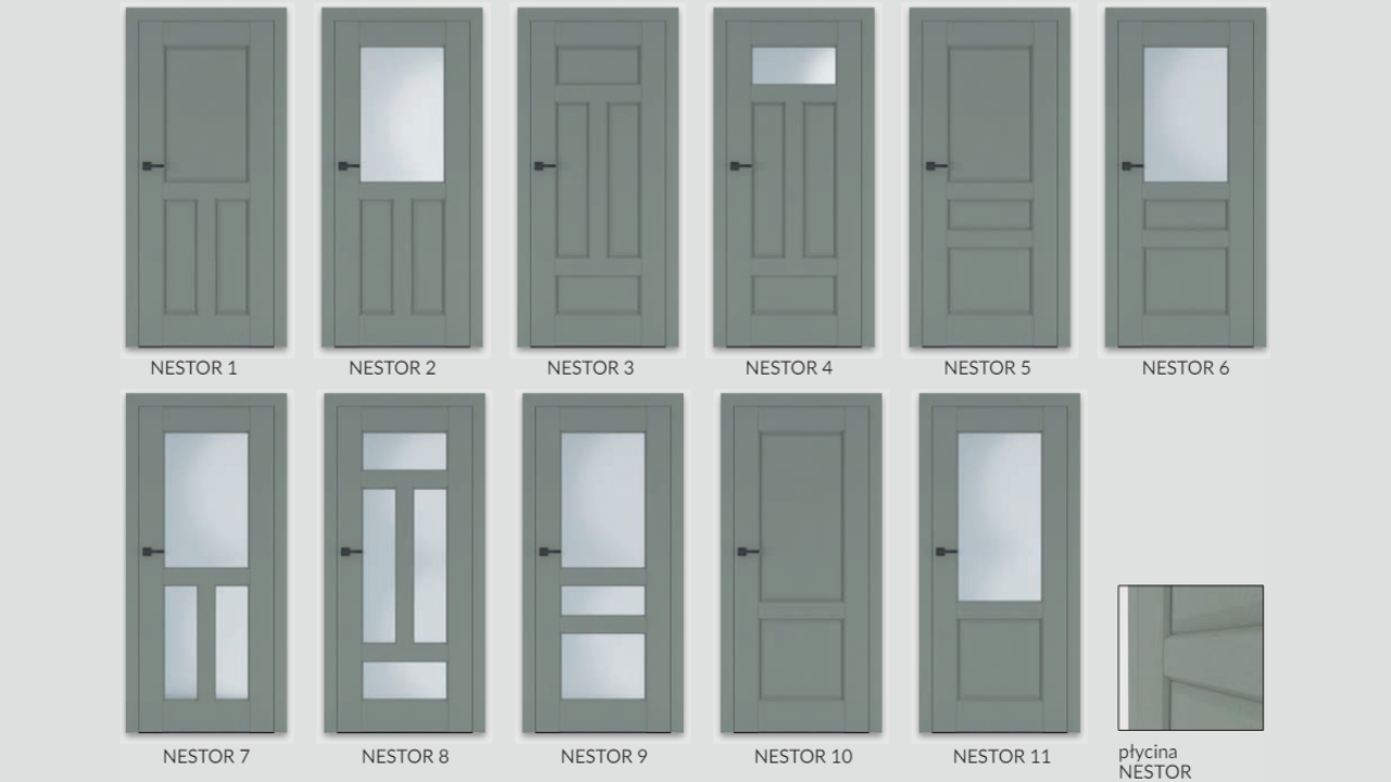 Skrzydła ramowe wykonane są w całości z płyty MDF. Grubość ramiaków pionowych wynosi 40 mm, a szerokość wynosi 160 mm, co zapewnia trwałą konstrukcję skrzydła drzwiowego. W drzwiach zastosowano szybę MAT DRE o grubości 4 mm oraz płyciny płaskie HDF. Kolorystyka i wzory skrzydła drzwiowego dostępne w galerii zdjęć.