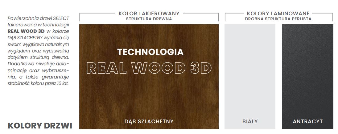 Kolor dąb szlachetny został wykonany w technologii Real Wood 3D, co przekłada się na atrakcyjny, naturalny wygląd skrzydła, odzwierciedla strukturę drewna (również w dotyku) oraz nie wykazuje negatywnych efektów w postaci łuszczenia, delaminacji czy wybrzuszeń. Drzwi SELECT, dzięki grubości skrzydła 75mm, solidnej konstrukcji i ciepłej ościeżnicy DUOTHERM osiągają efektywną termoizolację na poziomie Ud = 1,1 W/m²K (Ud = 1,0 W/m²K dla drzwi pełnych) Drzwi SELECT spełniają wymagania programu Czyste Powietrze.
