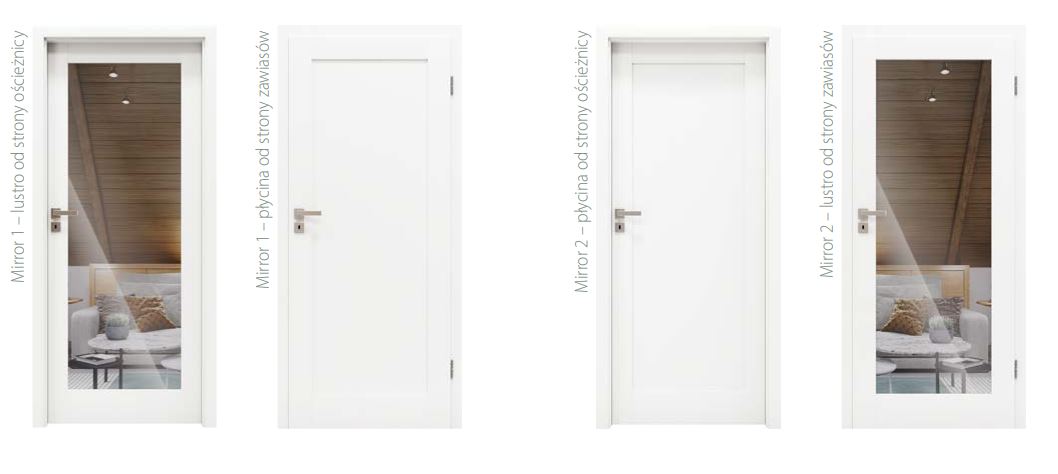 Drzwi wewnętrzne Mirror to nowa koncepcja w urządzaniu wnętrz. Skrzydło pokryte lustrem to doskonały sposób na optyczne powiększenie przestrzeni, dizajnerska kropka nad i, a jednocześnie praktyczny sposób, by dokładnie zobaczyć swoje odbicie w dużej tafli szkła.