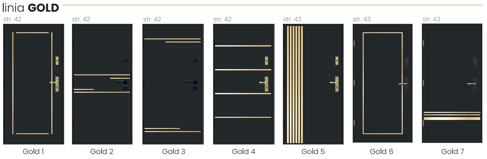 Drzwi zewnętrzne GOLD wyróżniają się wysoką estetyką i możliwością dopasowania do indywidualnych potrzeb – aplikacje dostępne są w opcji jednostronnej, wykonane z anodowanego aluminium. Linia GOLD obejmuje różne wzory, a szerokość aplikacji jest dopasowana do konkretnego modelu, od 10 do 30 mm, co pozwala na subtelne lub bardziej wyraziste wykończenie skrzydła.