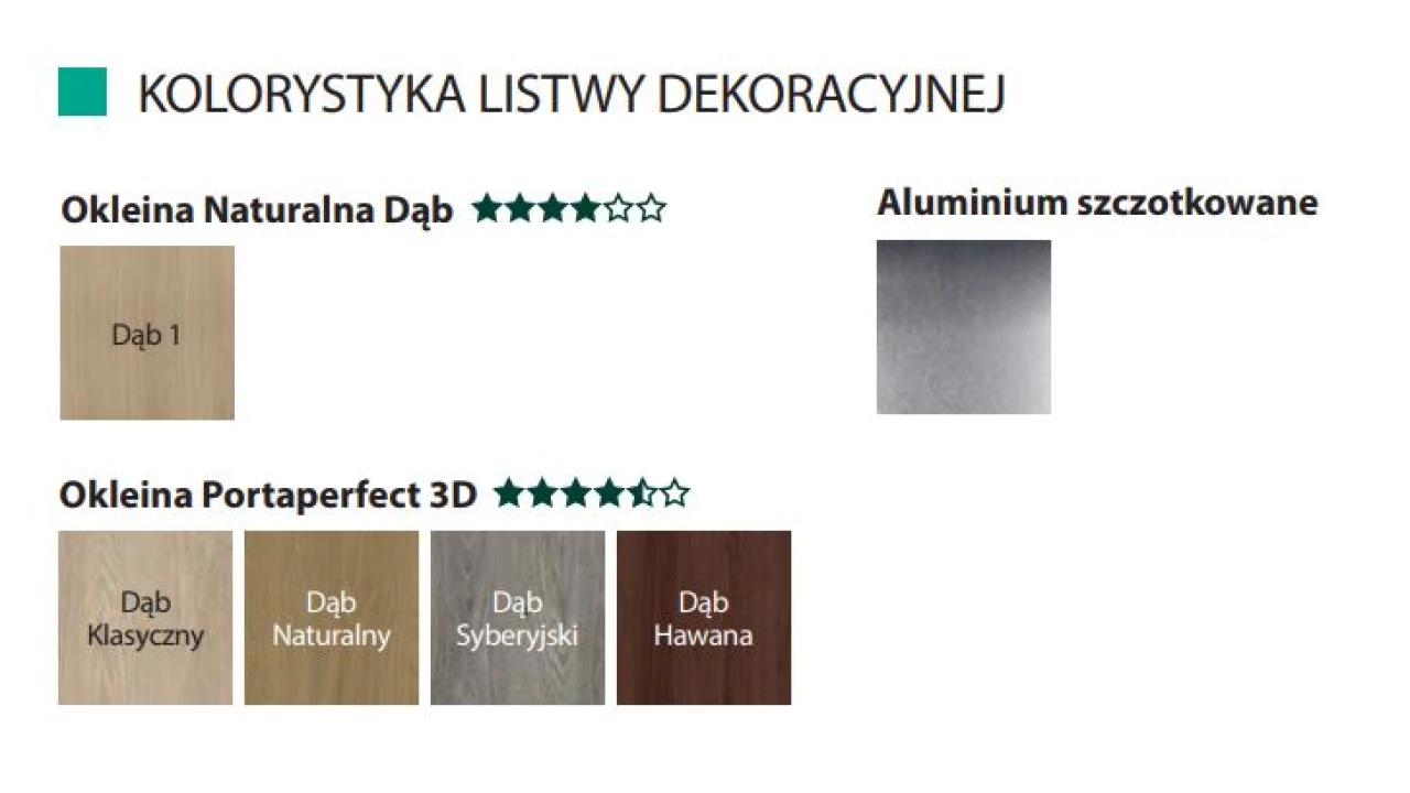 Możliwość wyboru listew dekoracyjnych z litego dębu, zlicowanych z powierzchnią paneli skrzydła (model F) lub w okleinie syntetycznej i naturalnej oraz aluminium szczotkowanym, cofniętych względem paneli skrzydła (model G).