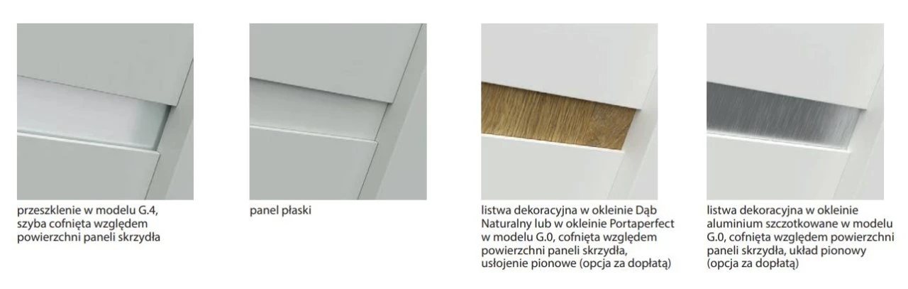 Możliwość wyboru listew dekoracyjnych z litego dębu, zlicowanych z powierzchnią paneli skrzydła (model F) lub w okleinie syntetycznej i naturalnej oraz aluminium szczotkowanym, cofniętych względem paneli skrzydła (model G).