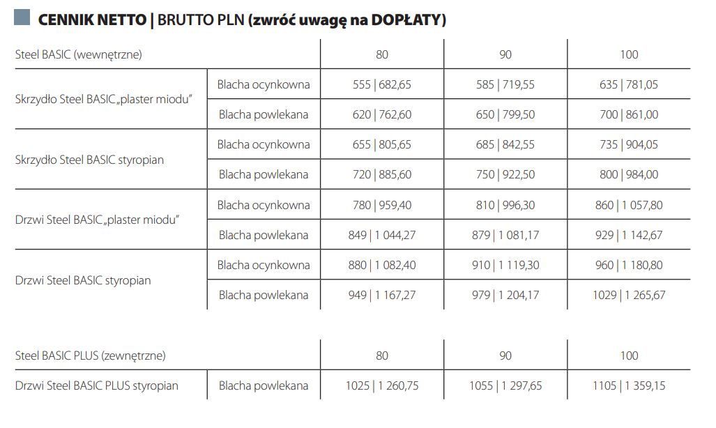 Steel BASIC to ekonomiczne rozwiązanie przy zachowaniu dobrych parametrów użytkowych. Drzwi świetnie sprawdza się w pomieszczeniach gospodarczych i nie tylko. Konstrukcja z blachy ocynkowanej i wypełnienie „plastrem miodu” gwarantuje trwałość i niezawodność. Drzwi dostępne są w kolorze: blacha ocynkowana oraz białym, popielatym i antracycie (blacha powlekana).