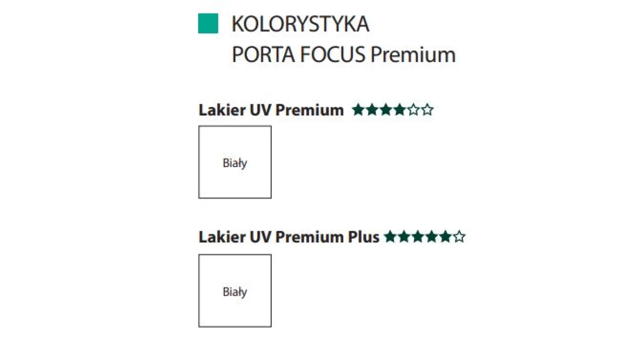 Drzwi z kolekcji PORTA FOCUS PREMIUM są dostępne w białym kolorze i mogą być pokryte Lakierem Premium lub Farbą Akrylową UV. Wybór tej drugiej opcji, czyli Farby Akrylowej UV sprawia, że kolor jest niezwykle trwały i pozostaje niezmienny przez długie lata (nie żółknie nawet pod wpływem światła). Co więcej, Farba Akrylowa UV jest odporna na zabrudzenia (np. plamy z kawy, tłuszczu lub alkoholu), ścieranie, zarysowania czy uderzenia. Najlepszy wybór do drzwi PORTA FOCUS PREMIUM pokrytych Farbą Akrylową UV to ościeżnica w Farbie Akrylowej UV.