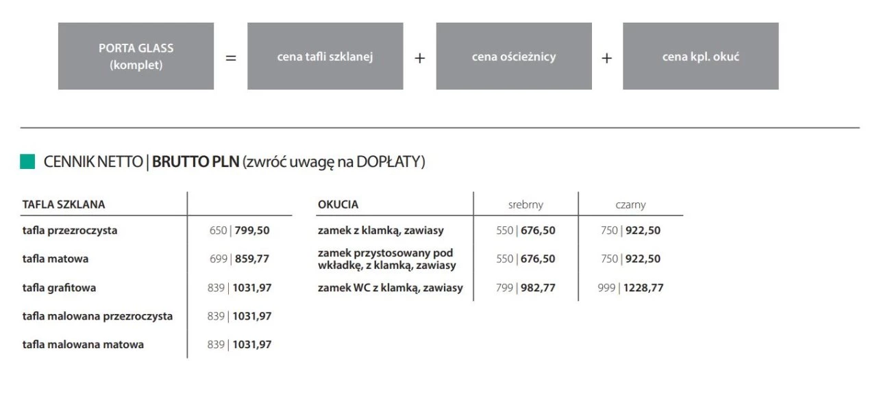 Modele z kolekcji Porta GLASS to propozycja dla ludzi ceniących sobie przestronność wnętrza i elegancję. Dzięki bogatej ofercie wzorów drzwi wkomponują się w nowoczesne i designerskie przestrzenie oraz podkreślą charakter wnętrza. Świetnie rozświetlają pomieszczenia jednocześnie będąc bardzo eleganckie. Nadają się do mieszkań, ale także do biur, czy lokali użytkowych, takich jak salony kosmetyczne. Szklane drzwi to jeden z top trendów w aranżacjach wnętrz. Komplet – ościeżnica, tafla szklana i okucia są sprzedawane razem. Z kilku dostępnych modeli można dobrać taflę przezroczystą lub ze szprosami, szybę matową lub taflę grafitową. Warianty dostępne w galerii zdjęć.