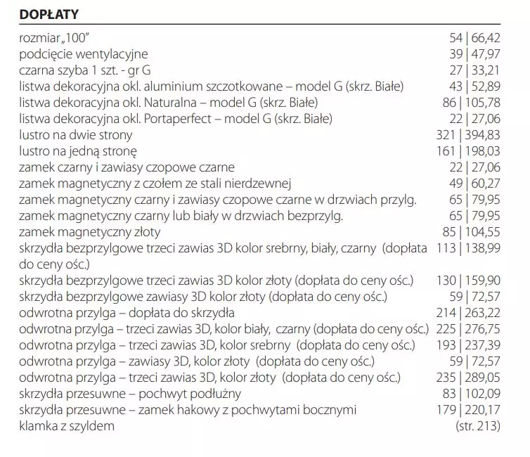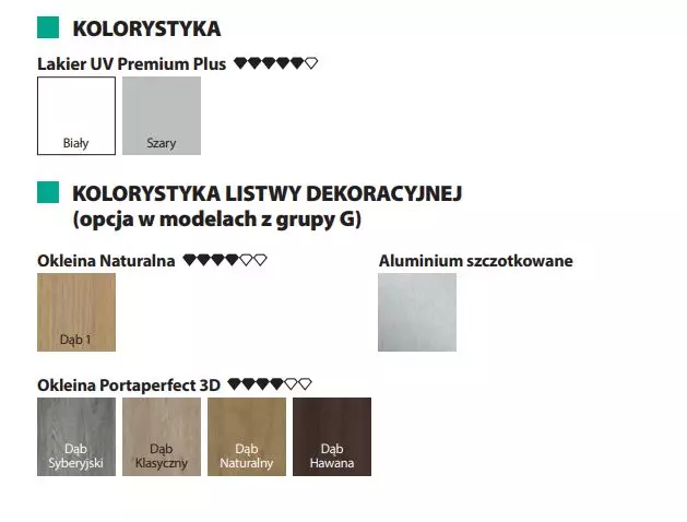 Możliwość wyboru listew dekoracyjnych z litego dębu, zlicowanych z powierzchnią paneli skrzydła lub w okleinie syntetycznej i naturalnej oraz aluminium szczotkowanym, cofniętych względem paneli skrzydła.